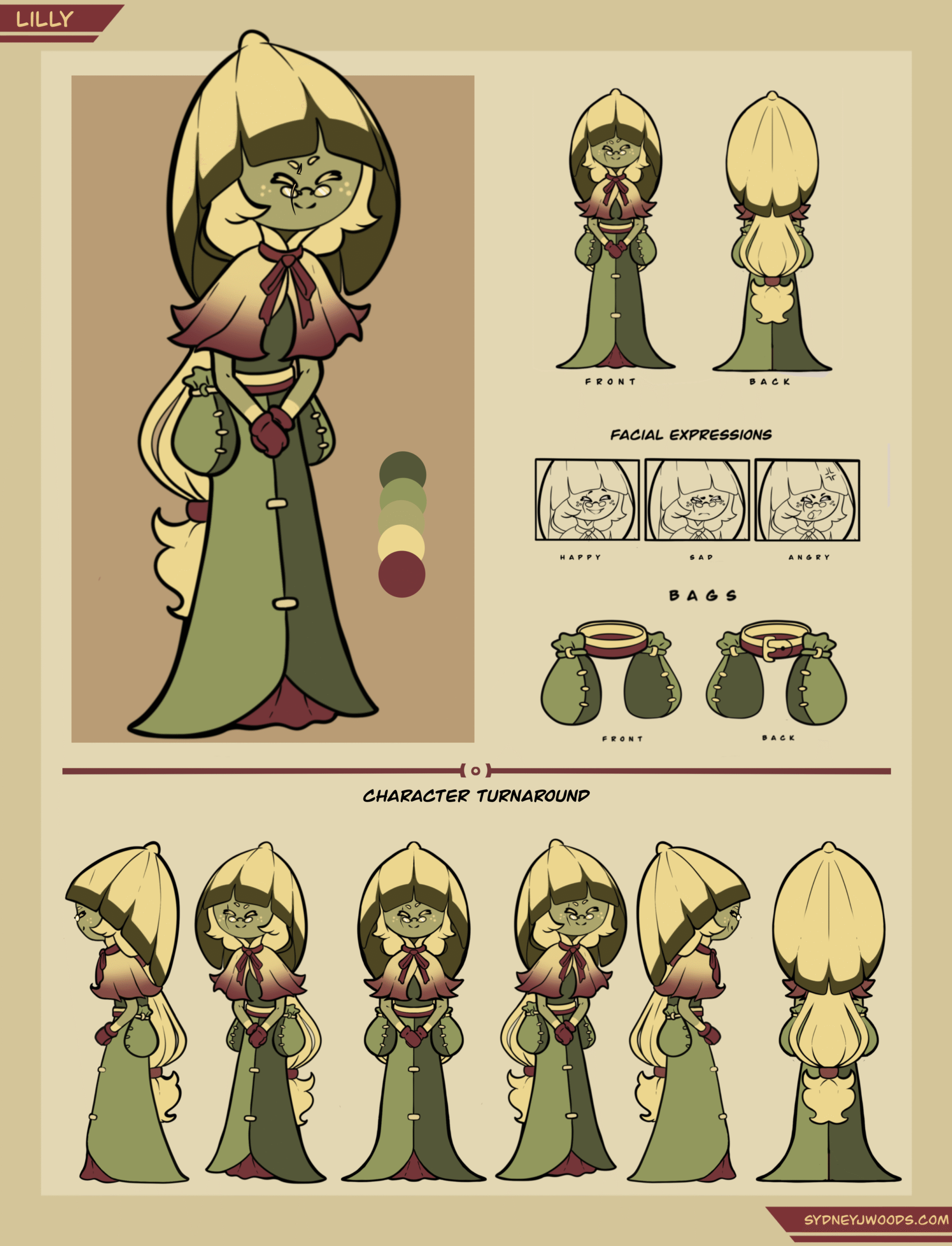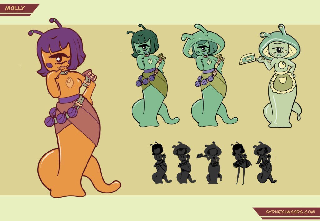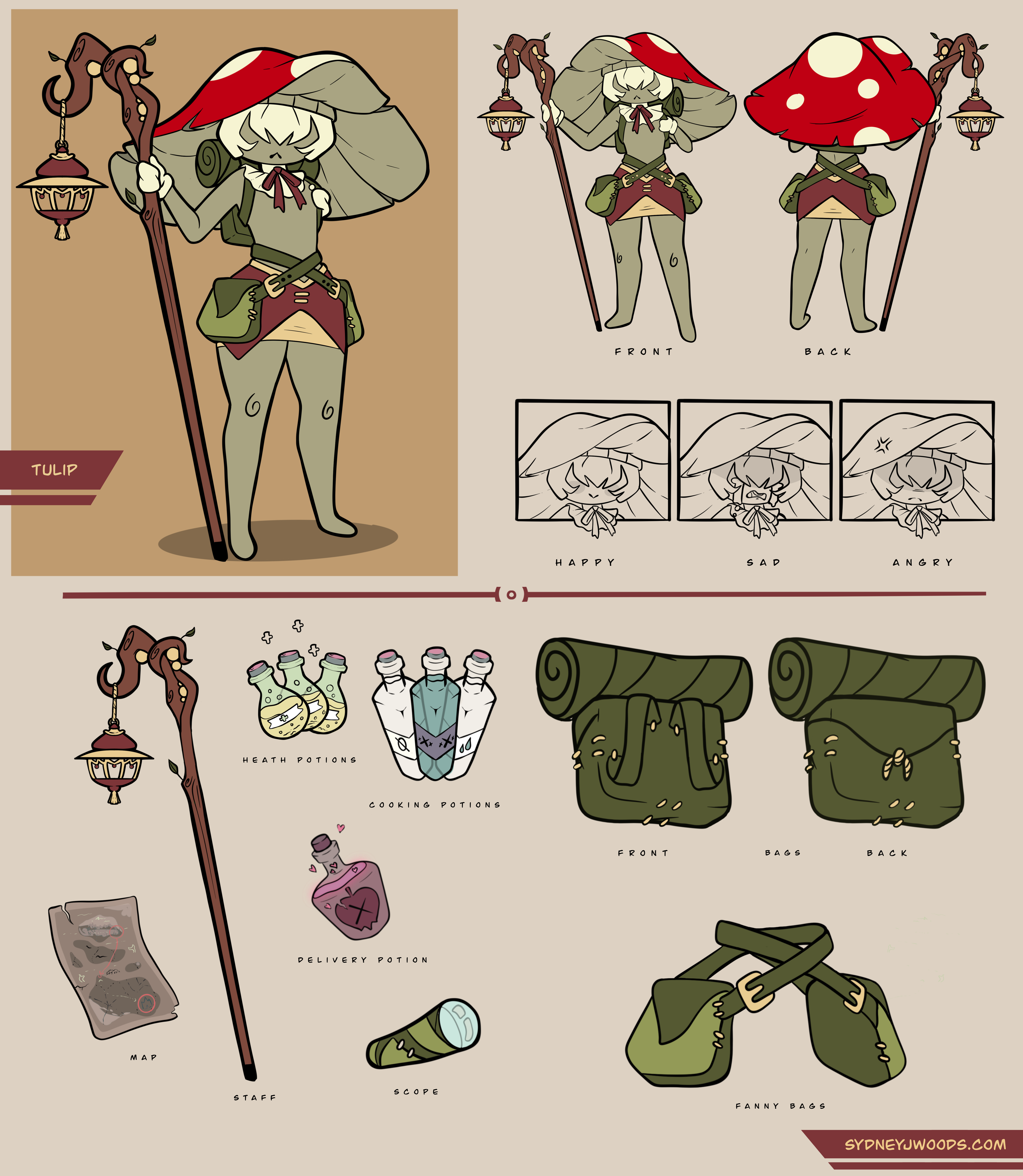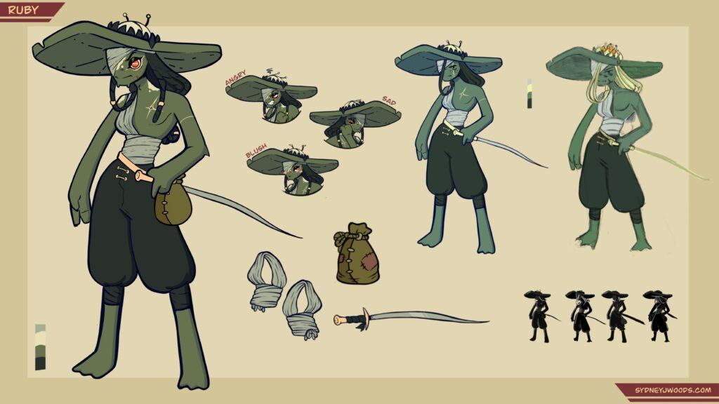 A complete stylized character concept sheet created for webcomic, including turnarounds, expression studies, and supporting prop designs to ensure animation and production readiness.