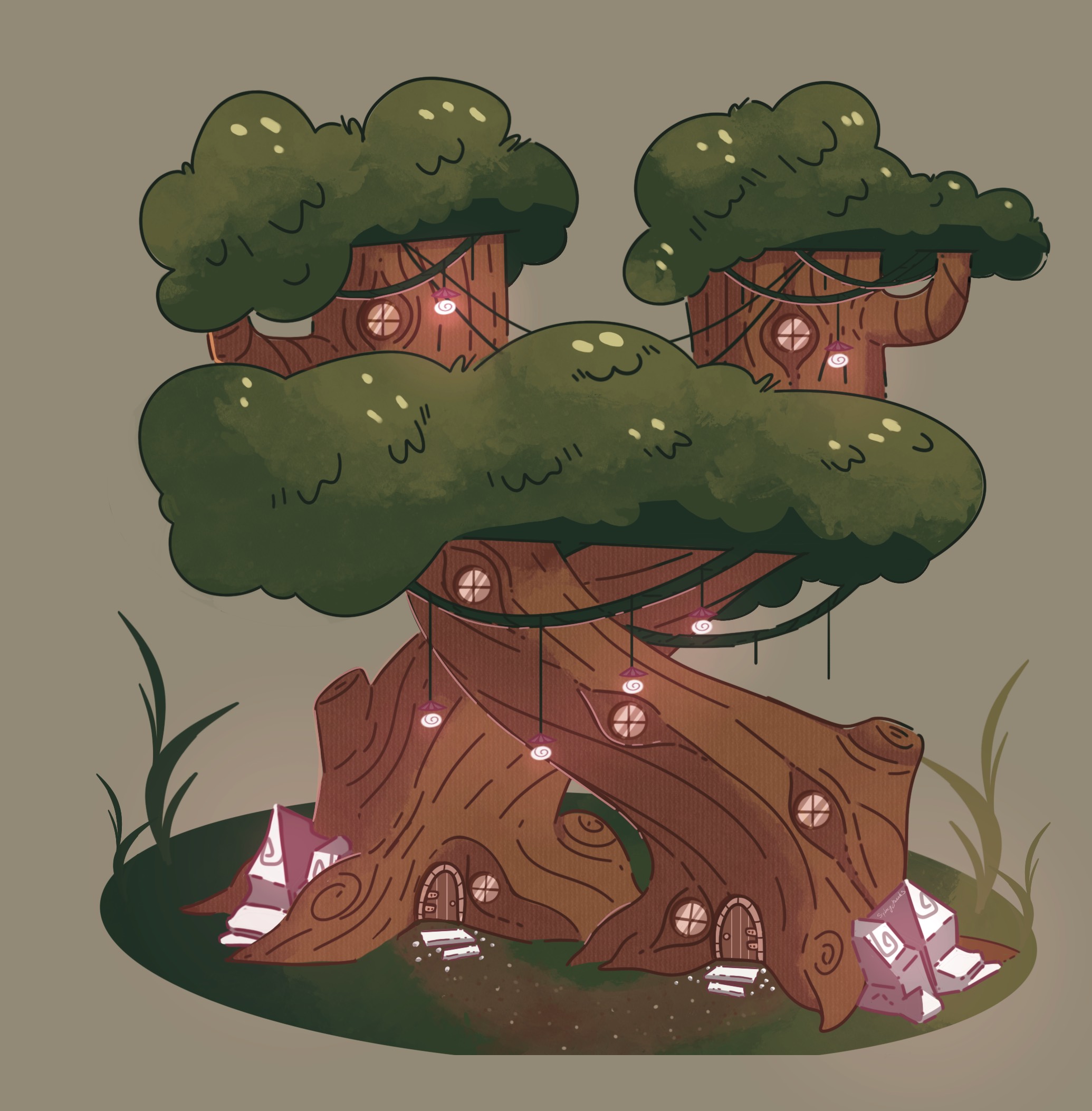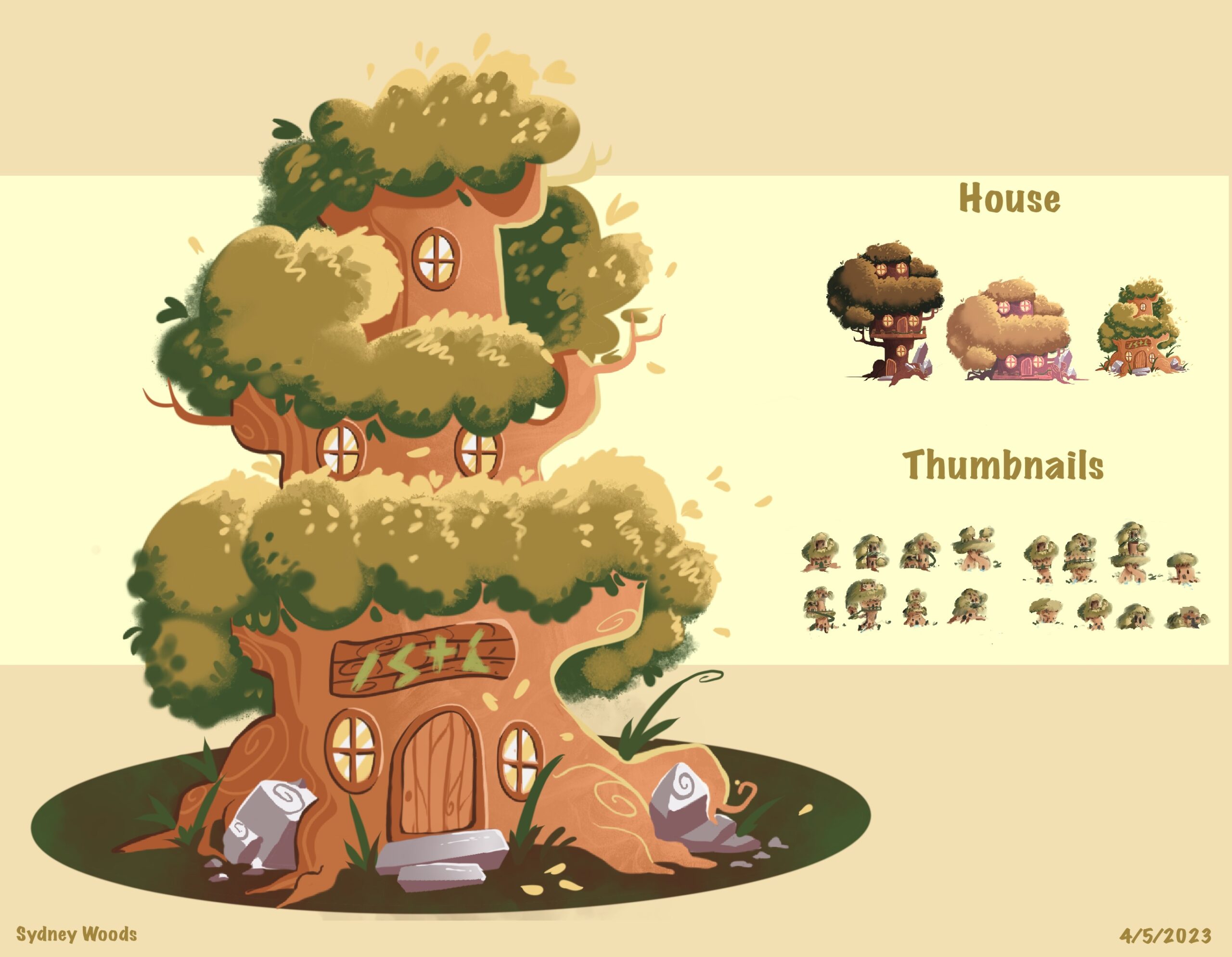Stylized treehouse environment concept created for a 2D fantasy comic, including final render and thumbnail explorations to develop structure, readability, and shape language.
